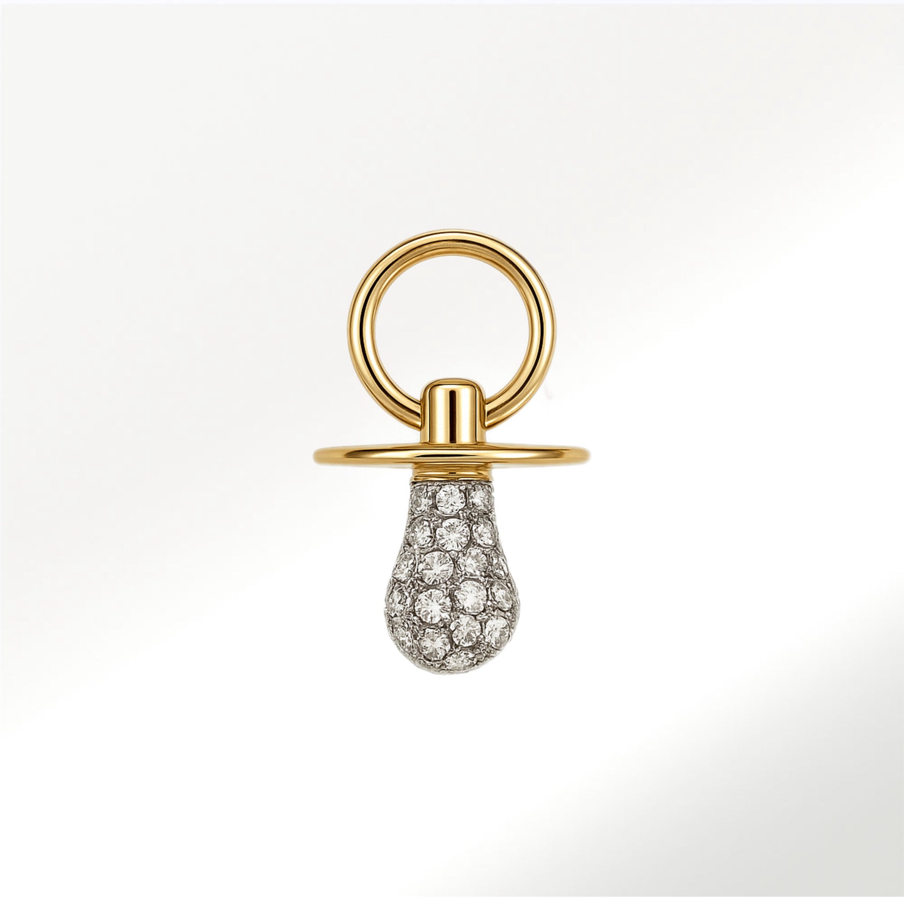 El chupete tiene un brillo maravilloso gracias a los diamantes blancos en talla brillante con un peso total de piedras de 0.11ct. Pureza VS, color G. El tamaño total incluyendo la anilla es de 12mm.