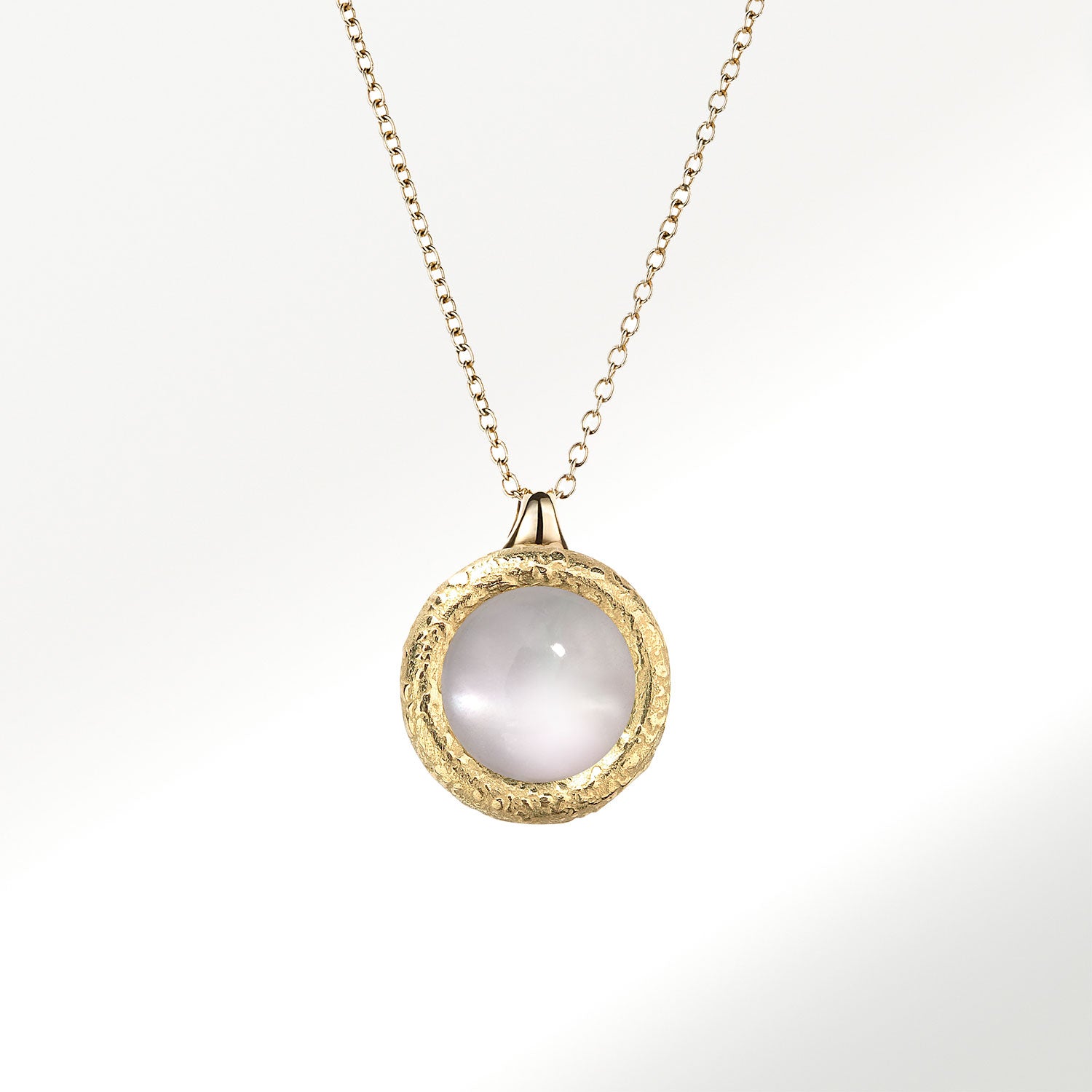 Collar Colección Fusión, realizado en oro amarillo de 18 quilates (750 milésimas), botón de 9mm con adularia piedra Luna, talla cabuchón sobre fondo de madreperla.
