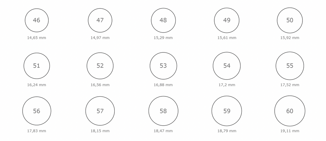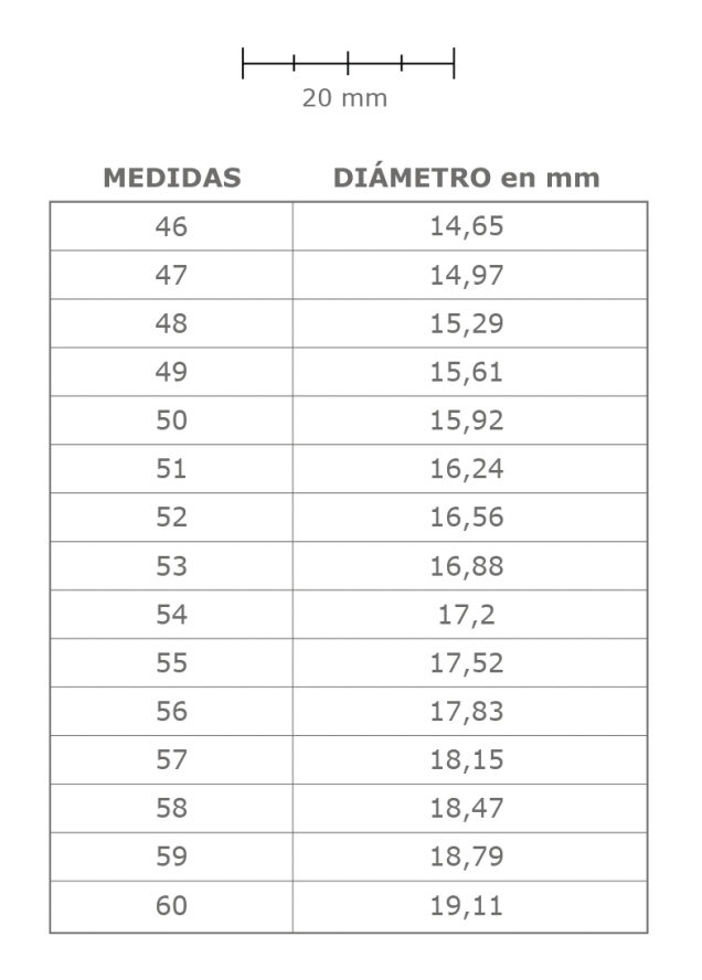 Con una regla, compruebe el diámetro interior del anillo y busque el equivalente del diámetro de los círculos: por ejemplo, si su anillo tiene un diámetro interior de 16,56 mm, su talla corresponderá a la talla 52. Si el diámetro que ha medido se encontrara en medio de dos tallas, elija la más grande.Para una comprobación adicional: